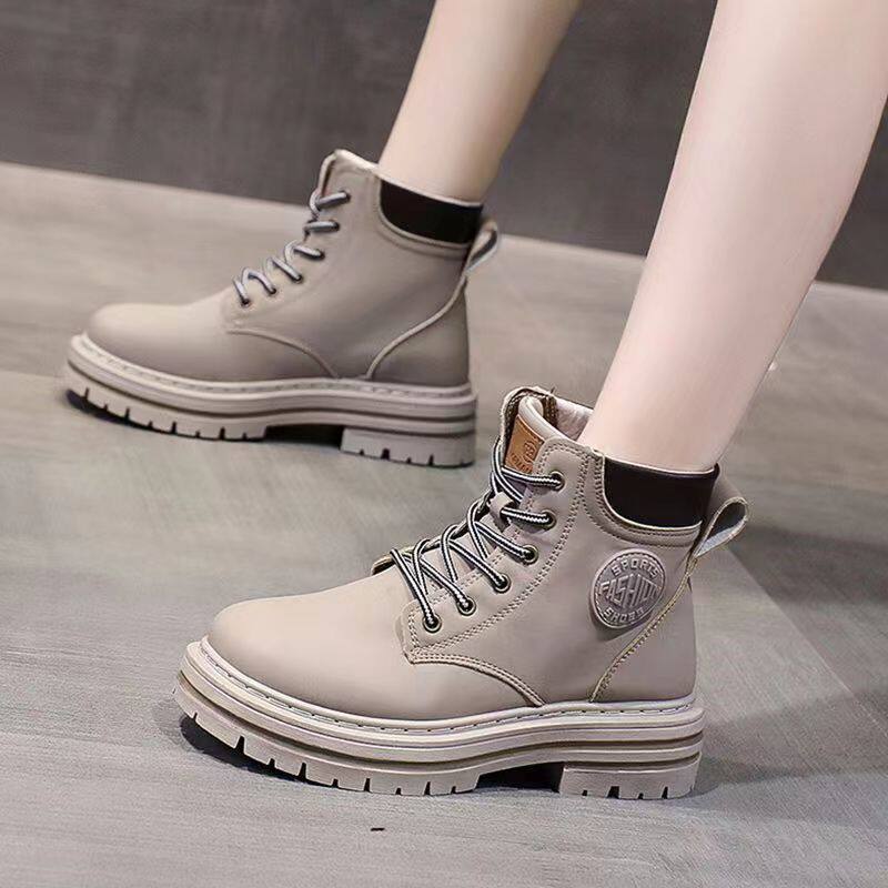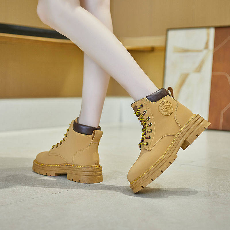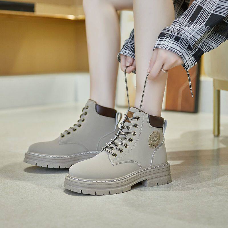 トレンドの厚底ソールと編み上げデザインが魅力的なショートブーツです。